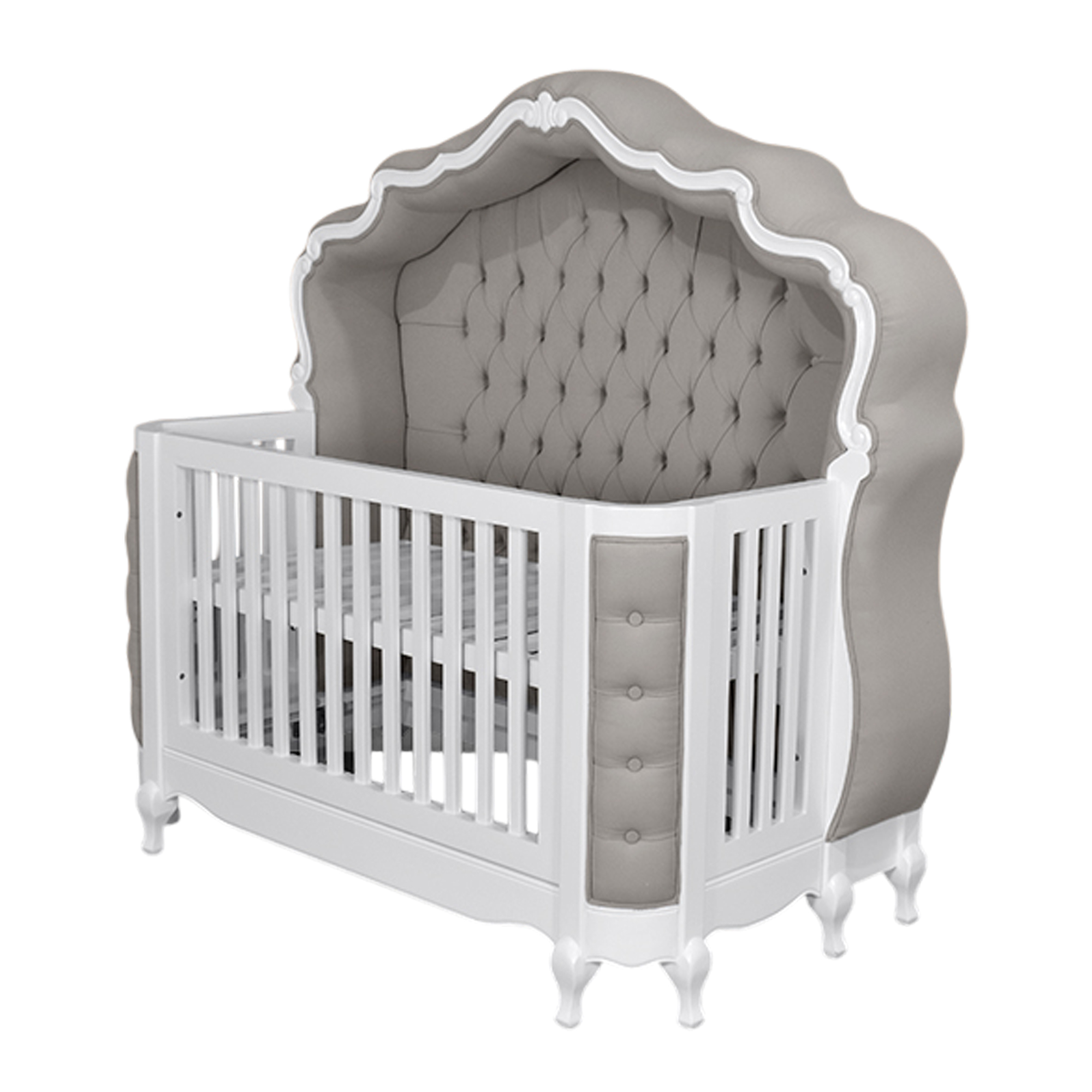 Adelle Baby Bed in French White with Grey Twill Fabric Upholstery for indoor use