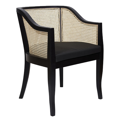 arm dining chair made from teak wood frame and solid natural rattan weave with cushions on the seat
