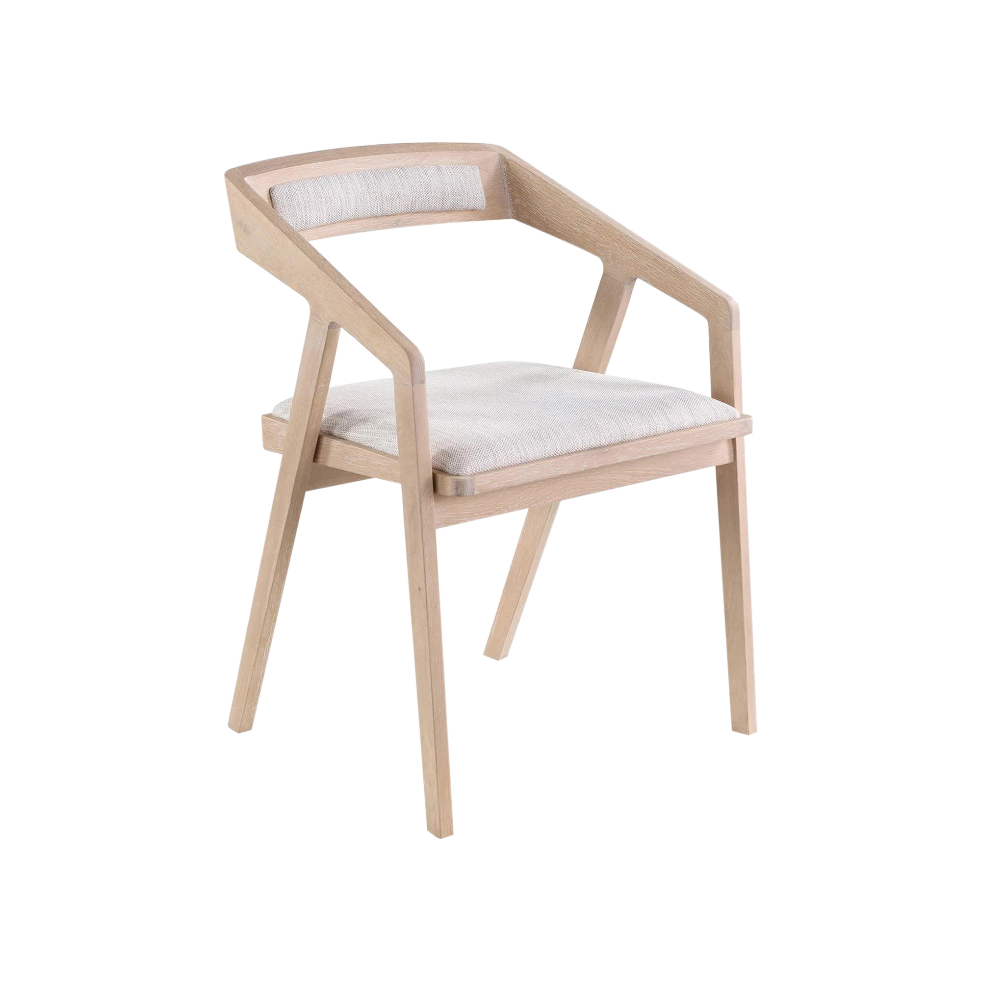 arm dining chair made of solid teak wood frame with seat and backrest wrapped in upholstery for indoor and outdoor