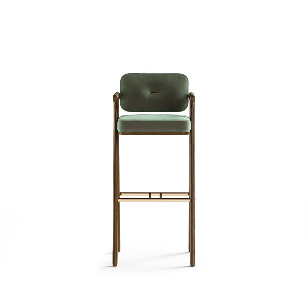 bar chair made from teak wood and solid gold iron with foam and fabric for indoor