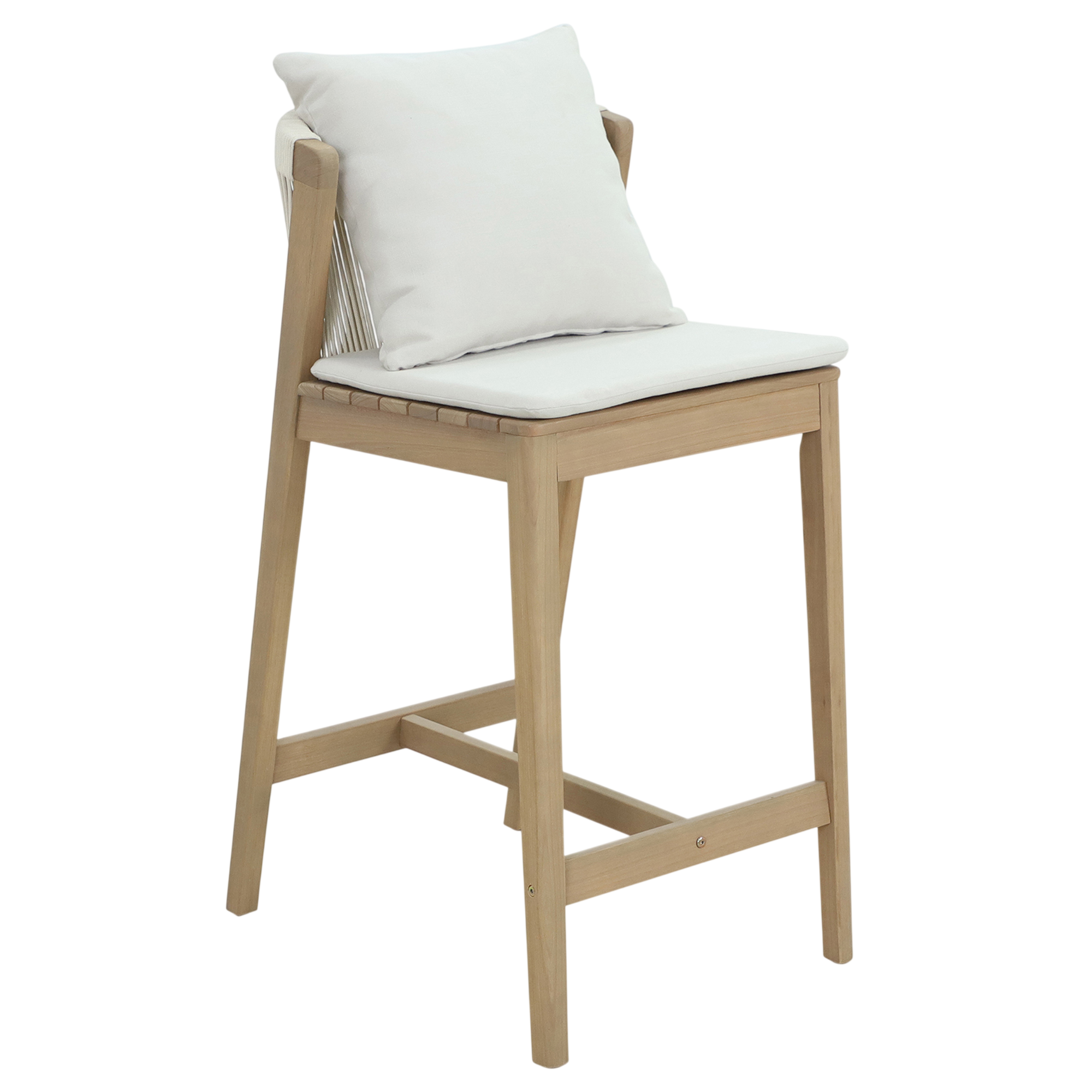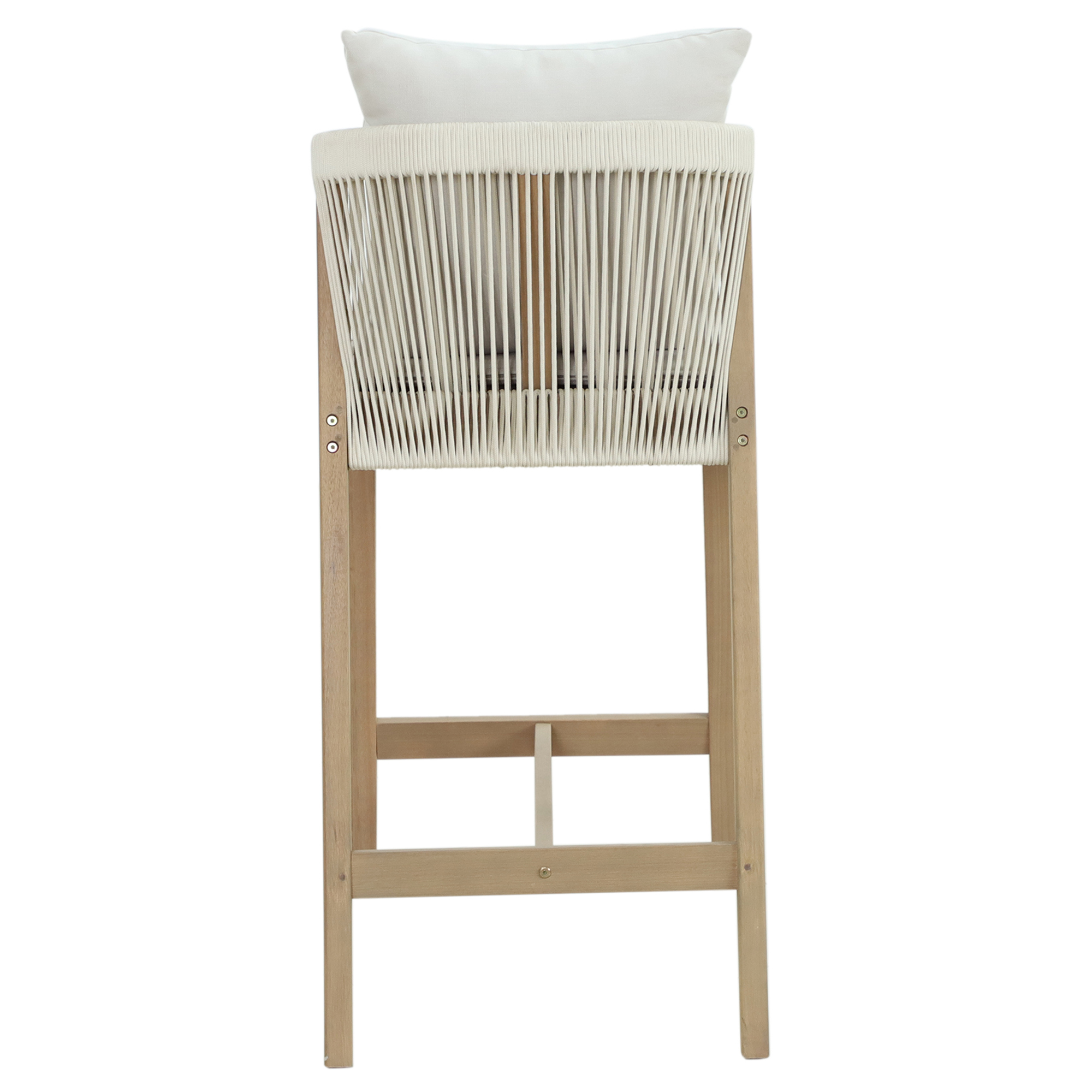 Bar chair made of teak wood equipped with woven rope backrest and soft seat