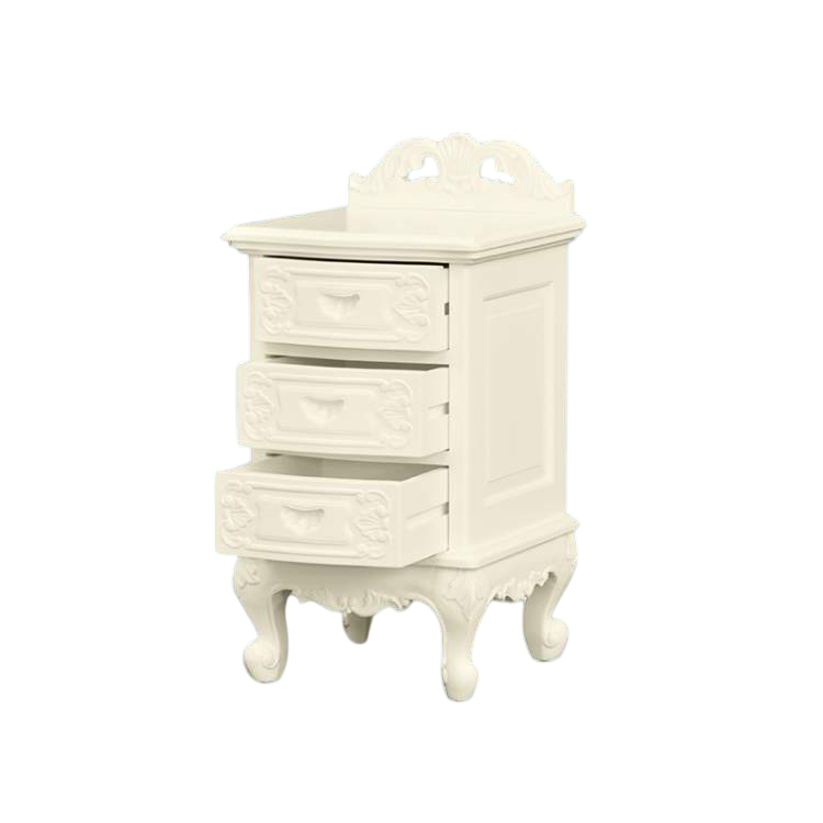 Bedside table made of mahogany wood with white color and carvings and equipped with 3 drawers for indoor use