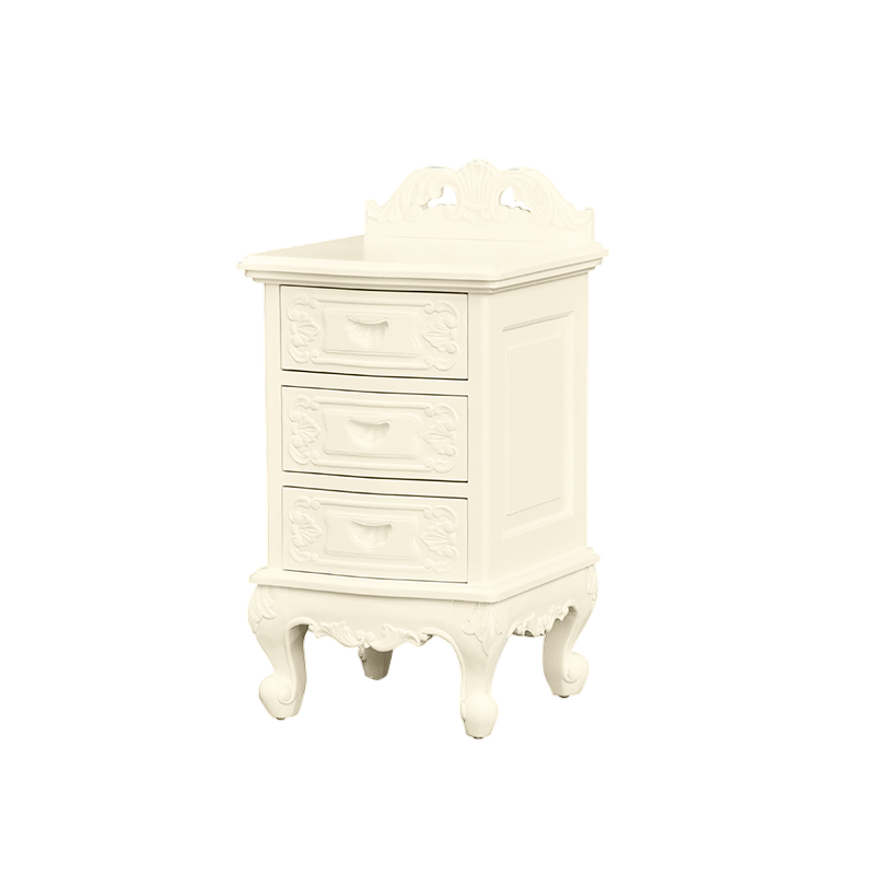Bedside table made of mahogany wood with white color and carvings and equipped with 3 drawers