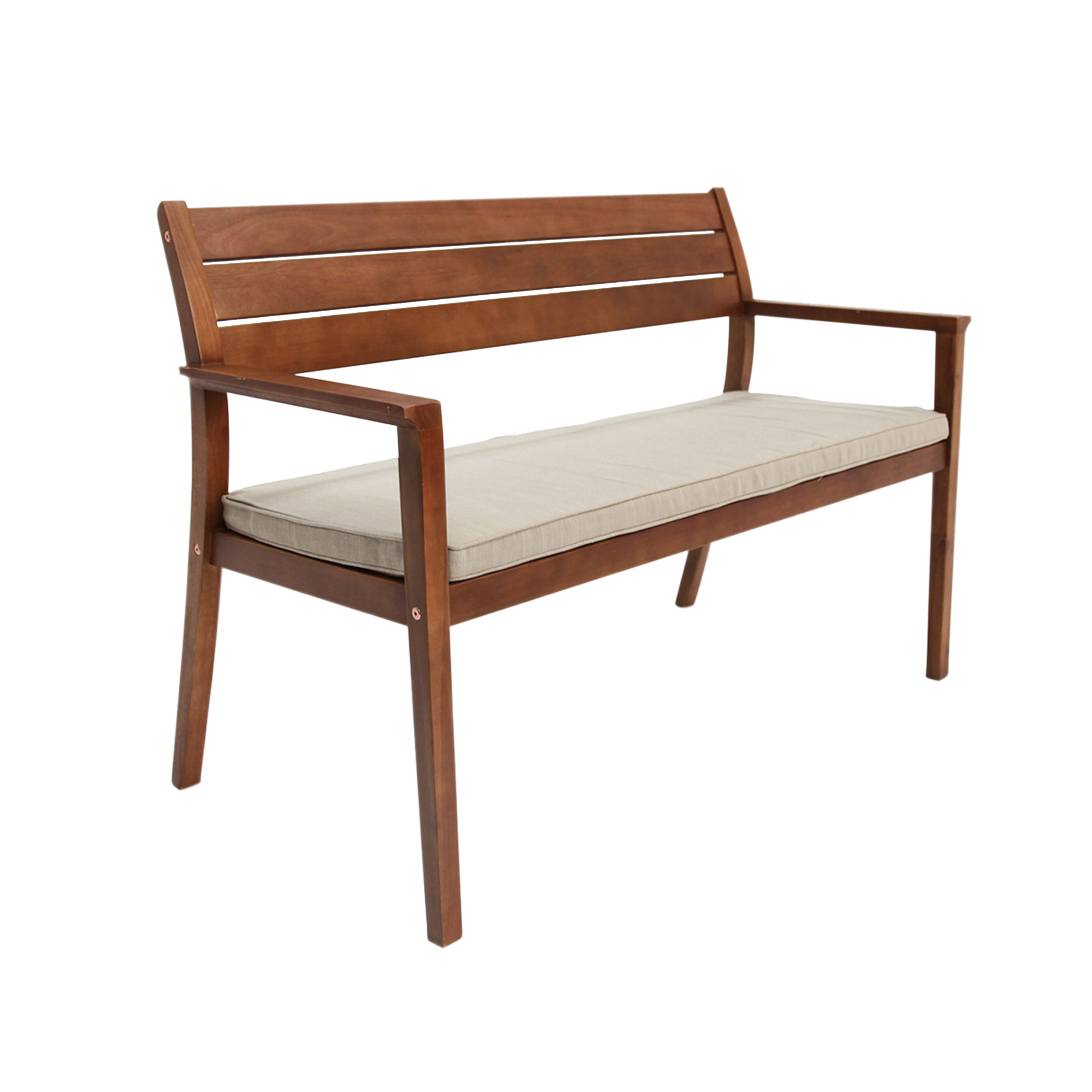 Bench made of teak wood with a dark brown finishing color and equipped with waterproof padding