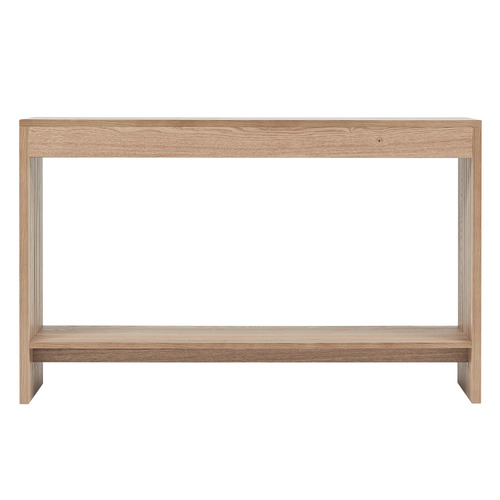 Console table made of natural wood with a simple design and functional bottom shelf for indoor use