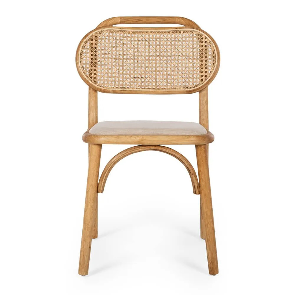 Dining chairs made from solid teak wood with woven rattan and fabric upholstery for indoor