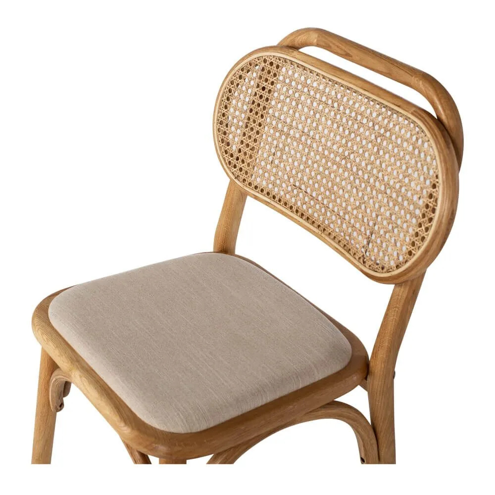 Dining chairs made from solid teak wood with woven rattan and fabric upholstery