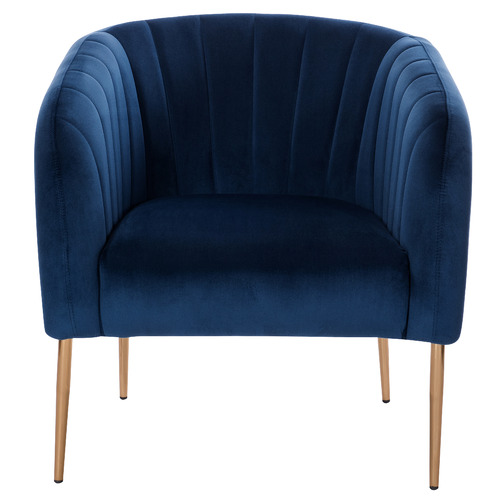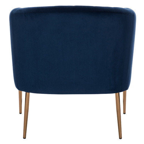 Laconia dark blue velvet armchair with teak wood frame and gold stainless steel legs for indoor use
