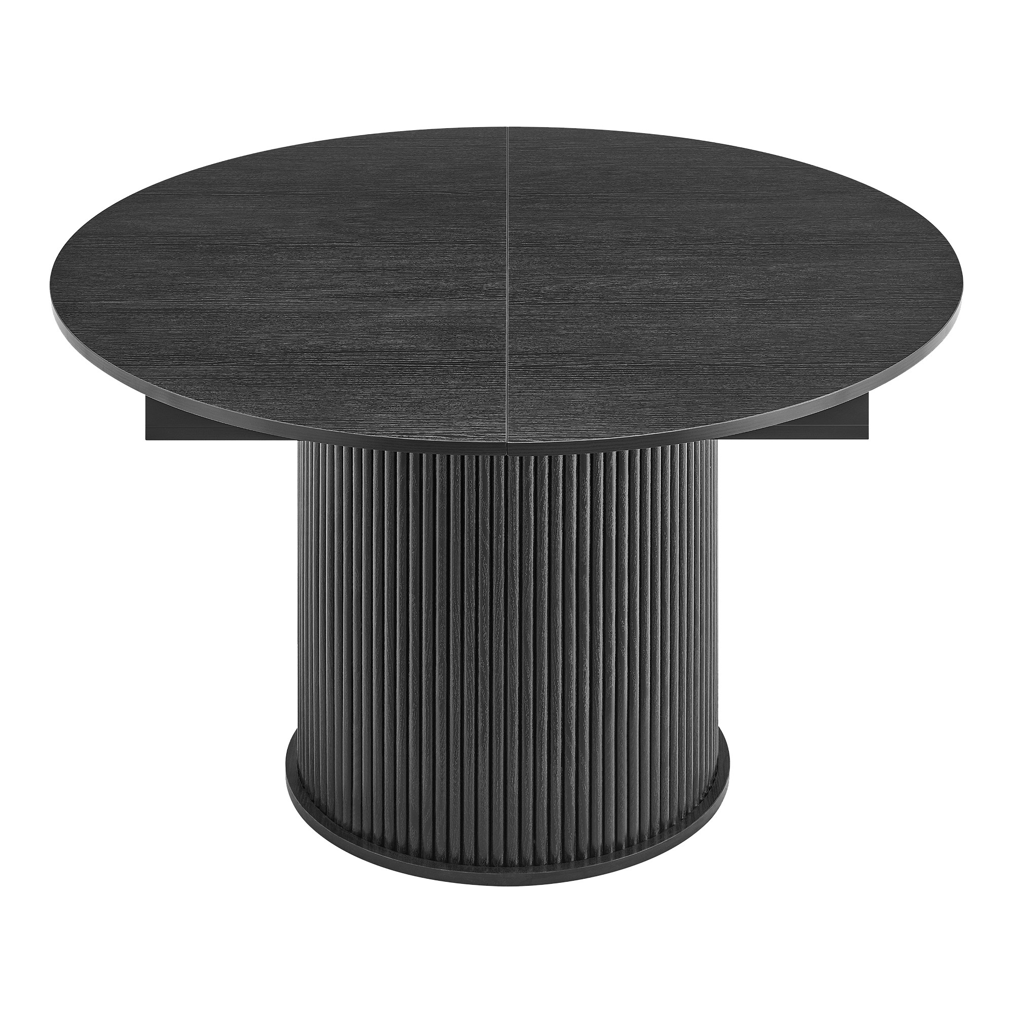 Modern dining table made of solid teak wood with an extendable table top with a black finish