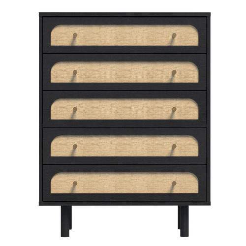 Modern dresser with matte black frame and natural wood panel accents on 5 drawers for indoor use