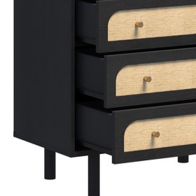 Modern dresser with matte black frame and natural wood panel accents on 5 drawers