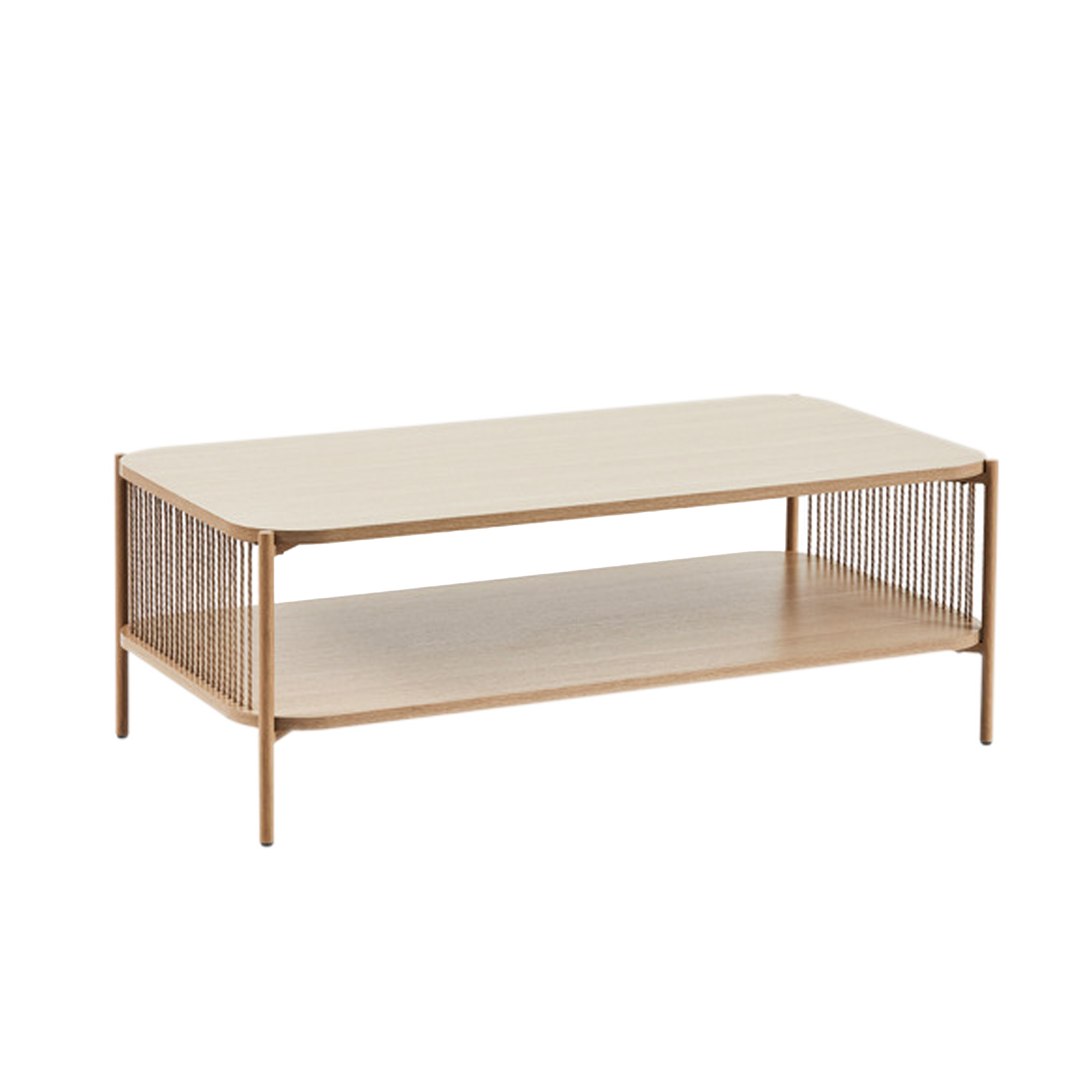 Rectangular coffee table made of natural teak wood with a minimalist design and multifunctional bottom shelf