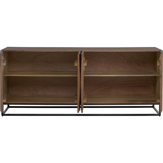 sideboard made of solid teak wood frame with dark brown color with iron for indoor