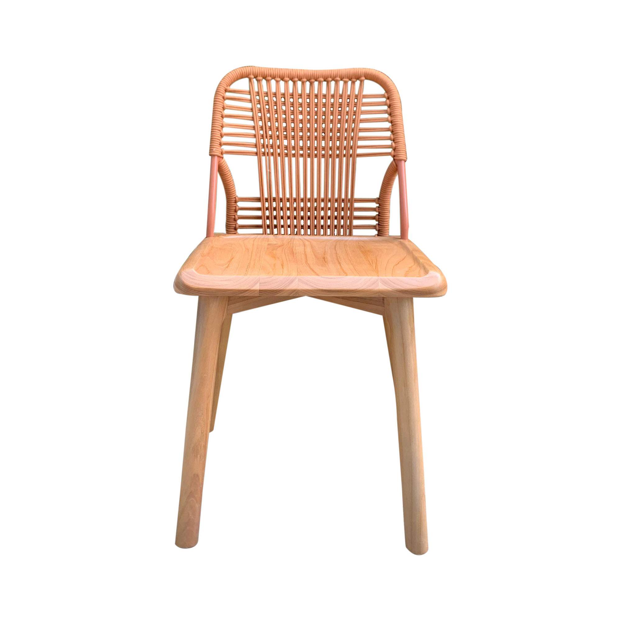 Simple garden dining chair made of solid teak wood and woven rope with natural finish for outdoor use