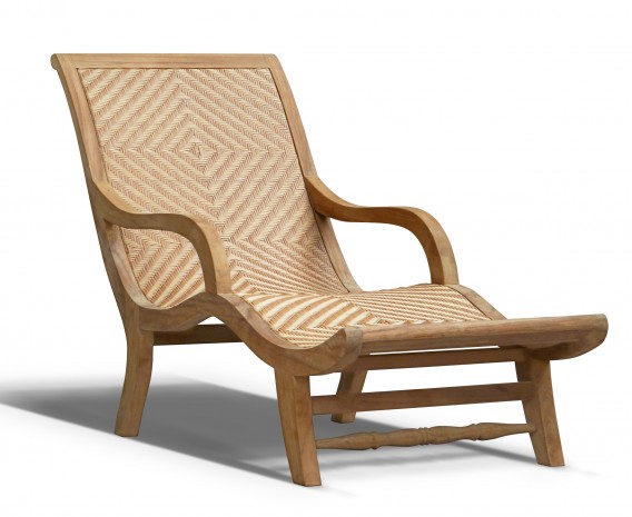 Simple lounge chair made of solid teak wood frame with premium quality rattan weave for outdoor use.