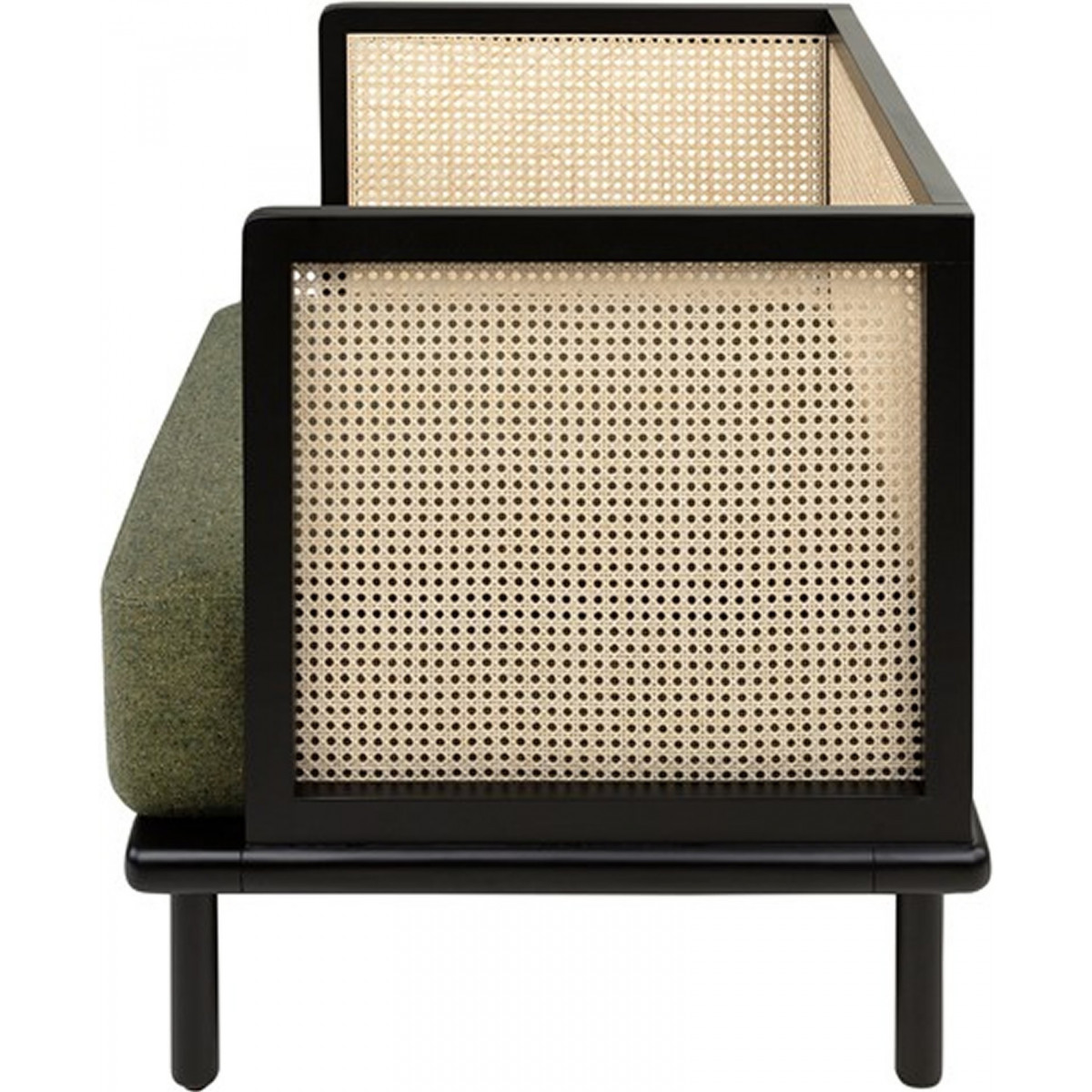 sofa made of solid teak wood frame with natural rattan backrest and equipped with seat cushion for indoor